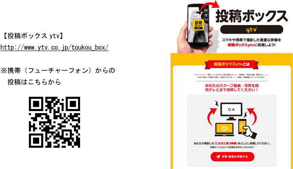 読売テレビは、一般視聴者からスマートフォンや携帯電話などで撮影した動画や写真の投稿を受け付ける「投稿ボックスytv」を開設。4月から運用を開始しました。