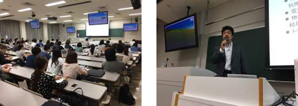 6月19日の講座では、読売テレビ報道局の高田裕都が講師を務め、「災害時のテレビ・東日本大震災で何が変わったか」をテーマに、阪神大震災や東日本大震災の際の災害報道の現場の模様や、南海トラフ巨大地震が発生した場合に備えた読売テレビの対策などについて、集まったおよそ200人の学生を前に語りました。