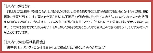ならば、『おんなのうたお届け委員会』が、おんなの本音を歌に乗せてお届けしましょう!