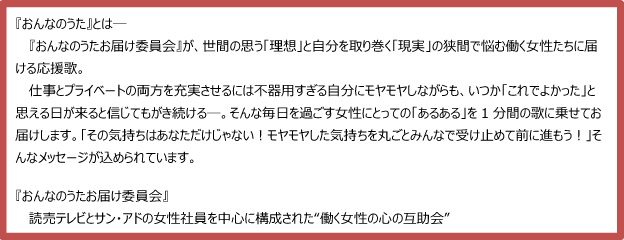 後編の放送を前に、読売テレビでは働く女性を集めたプレミアム試写会を実施しました。この試写会は、読売テレビ社内の女性を集めたプロジェクトチーム『おんなのうたお届け委員会』と、働く女性を中心としたコミュニティサイト「きらり部」がコラボする形で開催され、20代~40代の働く女性およそ30名が会場に集まりました。