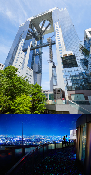 1993年3月25日、新梅田シティ内に完成した地上40階・地下2階・高さ約173メートルの超高層ビル。原広司が設計し、その独特の形状から大阪のランドマークとなっている。「TOP20 BUILDINGS AROUND THE WORLD」の一つに選出されるなど、世界的にも有名な建築物。タワーイースト、タワーウエストの2棟で構成され、その頂部を連結するように円形の空中庭園展望台を設置した構造。空中庭園展望台からは大阪の都心と遠景を一望でき、観光スポットとして人気である。また、空中庭園展望台には「空中庭園大明神」を祀る社があり、御利益は恋愛成就とされ、カップルの聖地としても認知されている。