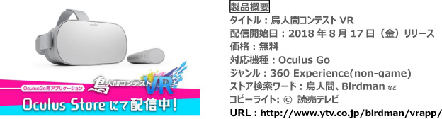 讀賣テレビ放送株式会社(以下、読売テレビ)は、米国Oculus社から発売されているヘッドマウントディスプレイ「Oculus Go」の専用アプリケーションとして、テレビ番組「鳥人間コンテスト」を360度動画で体験可能にした、『鳥人間コンテストVR』を2018年8月17日(金)よりOculus ストア上で無料配信スタートしました。