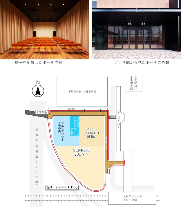 デッキ沿いには旧よみうり文化センターの面影を残すれんが調の「SENRITOよみうりホール」(100㎡、最大130席)を設けました。講演会やセミナー、イベントなどに利用できる多目的ホールで、3月1日から貸し出しを始めます。豊中市と市民の協働事業にも協力し、地域の文化・芸術活動の場としても活用します。また、北側のデッキは同センターの通路に使われていた「煉瓦(れんが)通り」の名称を復活させ、植栽やベンチを配置して、憩いの場となっています。