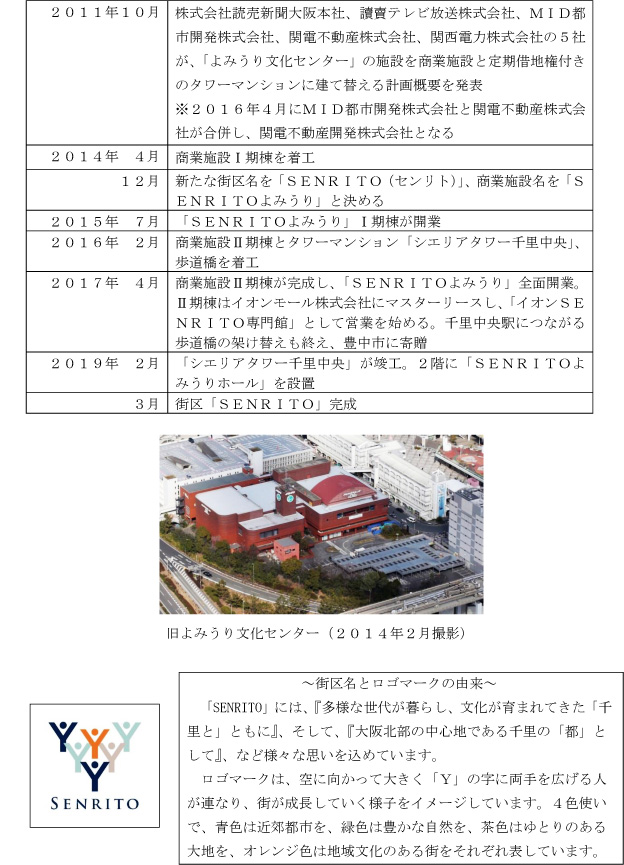 本事業は、総合カルチャーセンター「よみうり文化センター」を商業施設とタワーマンションに建て替えるもので、2011年にスタートしました。よみうりグループが運営する商業施設は「SENRITOよみうり」として2017年4月に全面開業しており、約60の店舗やクリニックが営業しています。北大阪急行の延伸を控え、千里中央地区は官民による大規模な再整備が予定されており、街区「SENRITO」はその先駆けとなります。