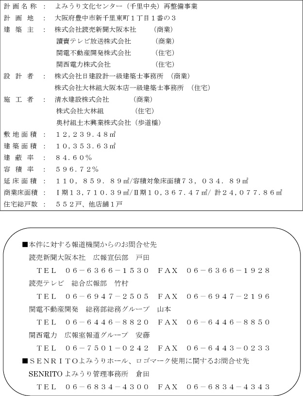 株式会社読売新聞大阪本社と讀賣テレビ放送株式会社(以下「よみうりグループ」)が、関電不動産開発株式会社、関西電力株式会社の2社(以下「関電グループ」)を共同事業者として、大阪府豊中市の千里中央駅前で進めてきた「よみうり文化センター(千里中央)再整備事業」(以下、本事業)で、関電グループが建設を手がける「シエリアタワー千里中央」(52階建て、552戸)が2月末に竣工し、新たな街区「SENRITO」が、3月1日(金)に完成します。