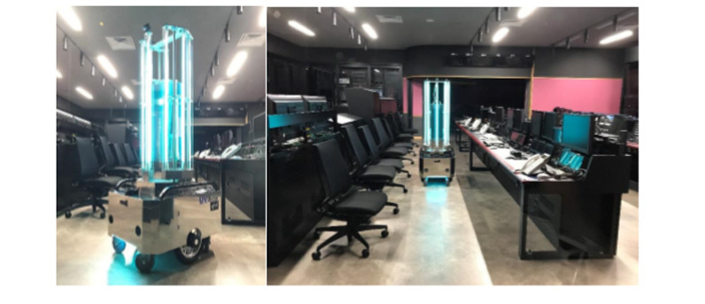 遠隔操作で自走も出来るこの殺菌ロボットは、新型コロナウイルスを不活性化(死滅)することが実証されており、高出力の紫外線でウイルスや細菌を殺菌・除去することで感染症拡大を防ぎます。高さが約170センチあり照射アームが可変式となっているため、マスターやサブ、リモートセンターなど放送設備の壁面だけでなく機材や机の上面、床面など隅々まで紫外線を照射してまわります。