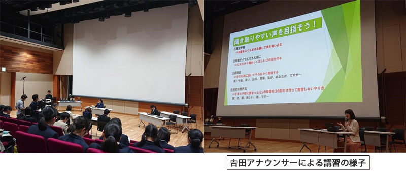 読売テレビからは、𠮷田奈央アナウンサーが審査員として参加。合わせて、アナウンス講習会も行ないました。講習会では𠮷田アナウンサー指導のもと、実際に放送されるPR映像に合わせてナレーションにチャレンジしました。𠮷田アナウンサーは「伝わるためには速さ(緩急)、音の高低、大きさ、間がポイント。また伝えたい内容を理解し想像することが大事」と解説しました。