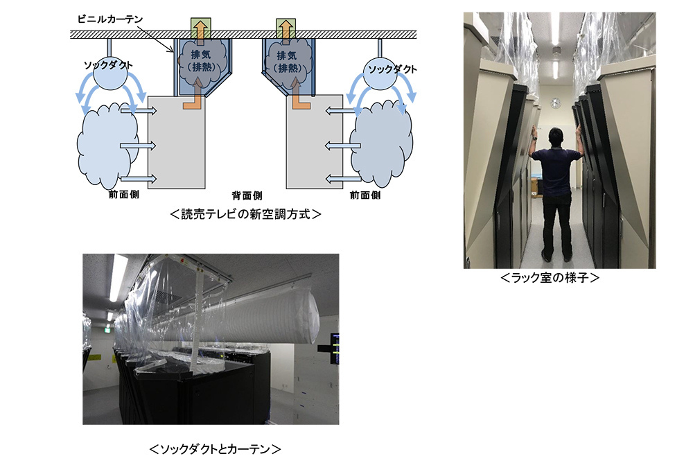 放送局では初の採用となる“不燃性ソックダクト(筒状のフィルター)”と読売テレビ独自で作り上げた“キャッピング(囲い込みによる気流制御)技術”を融合することで、①環境にやさしい(省エネ)、②人にやさしい(寒くない)、③機器にやさしい(結露しない)、④財布にやさしい(低コスト)という「4つの”やさしい”」を実現し、シミュレーション上、空調コストを“約1/3低減”可能な空調方式を考案し、かつ“人にも環境にもやさしい”設定温度26℃の理想的なラック室を構築することができました。