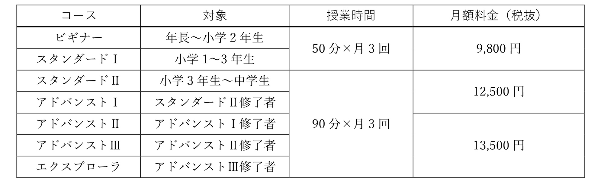 ・小学生コース:90分×月1回、3,500 円(教材費込み 。 別途、消費税)
