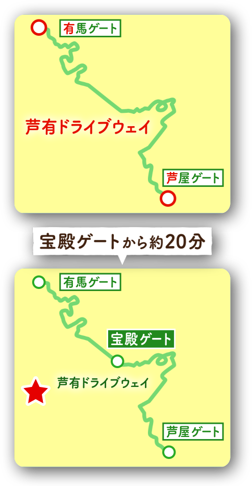 芦有ドライブウェイ、芦屋ゲートからおよそ5分。