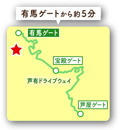 芦有ドライブウェイ、有馬ゲートからおよそ5分。