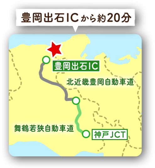 舞鶴若狭自動車道から北近畿豊岡自動車道 豊岡出石インターチェンジを降りておよそ20分。