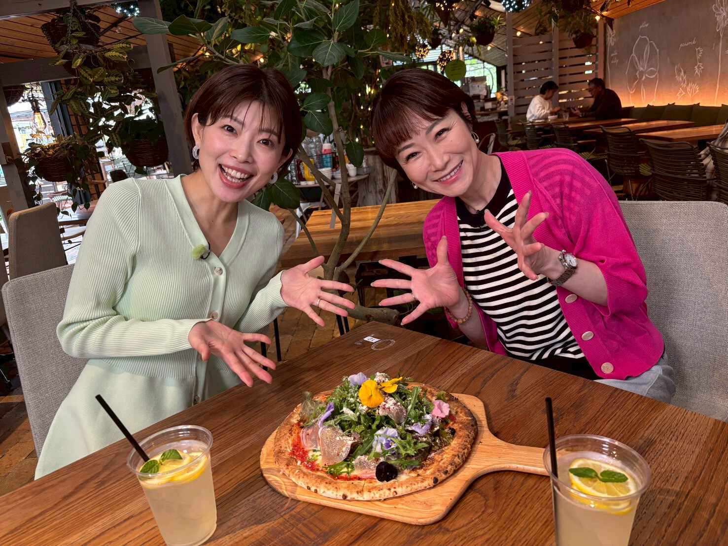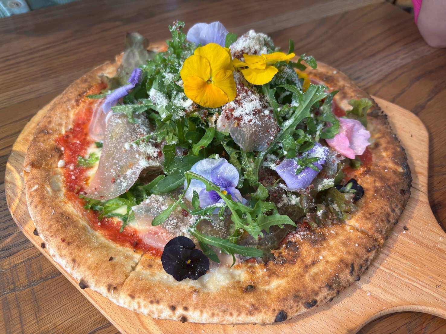 生ハムとルッコラのガーデンピザは、食べられる花があしらわれ、見た目に可愛いだけでなく、おいしいですよ!
