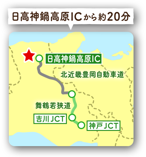 舞鶴若狭道から北近畿豊岡自動車道、 日高神鍋高原ICをおりて20分 。
