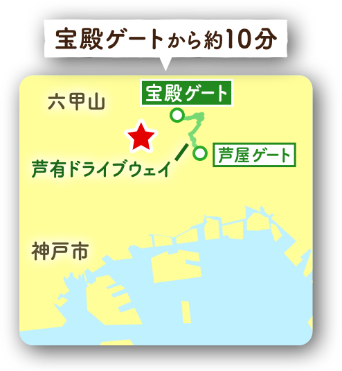 芦有ドライブウェイ 宝殿ゲートからおよそ10分。