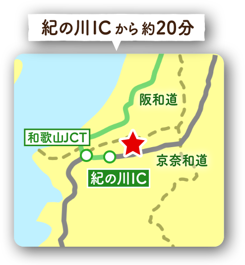 阪和道から京奈和道「紀の川インターチェンジ」を降りておよそ20分。