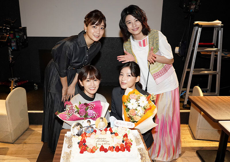 お祝いの現場となったのは、“彼女たち”に関するシーンのリハーサル直後。スタッフより「7月10日は前田敦子さん、7月11日は石井杏奈さんのお誕生日です!」と声がかかると、「Happy Birthday」の音楽が流れ、深川とさとうがケーキを持って登場。キャスト・スタッフ一同「おめでとう!」の掛け声と拍手とともに、花束も贈られ、「ありがとうございます!」と笑顔が溢れた。