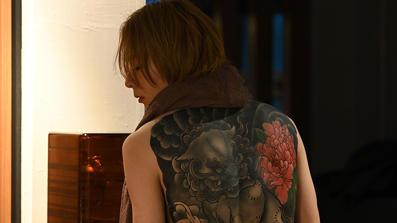 さらに、放送中に、SNSで「刺青の背中を拝めてありがとうございました」、「刺青の背中かっこいい…」とあまりの色気に多くの視聴者から思わず声が漏れた、獅郎の「牡丹に唐獅子の刺青」写真も本リリースにて緊急公開!撮影が始まる前の支度におよそ3時間を要して仕上げられる、美しい背中をご堪能あれ!