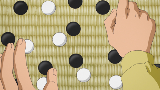 この日、対局を控えていた星と海峰。三ツ石は星に負けるのを恐れて殺害したと海峰を疑う。三ツ石は、はじめと剣持が長い廊下を歩いている間に星は庭を通って物置から遺体を出して血溜之間に置いたと推理。その後、何食わぬ顔で碁石の入った碁笥を持って再び血溜之間に現れたと考える。それなら1分半あれば間に合う計算だった。ピアニスト志望の海峰は囲碁くらいで殺害を否定し、碁石を集めていたのにそんな時間はないと訴える。はじめは池の底に散らばった碁石を白黒分けて碁笥に入れる時間を検証し、時間的に海峰の犯行は不可能と判断する。