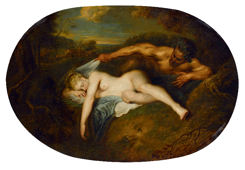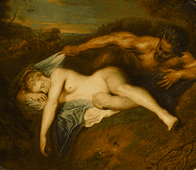 山や泉などの自然物の精であるニンフと、人間の身体とヤギの脚を持つサテュロスを組み合わせたエロティックな情景は、古代美術に端を発し、ルネサンス以降はティツィアーノ、コレッジョ、ルーベンス、ヴァン・ダイクなど、名だたる画家たちによって描かれました。18世紀前半に活躍したフランスの巨匠ヴァトーによる本作は、この系譜に連なるものです。欲望に駆られたサテュロスは、無防備に眠るニンフの身体からベールをそっと持ち上げ、美しい裸身にみとれています。男性/女性、見る(能動的)/見られる(受動的)、褐色の肌/白い肌といった対比が、濃厚なエロティシズムをいっそう強めています。