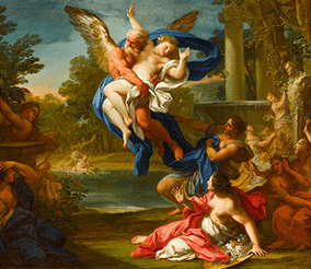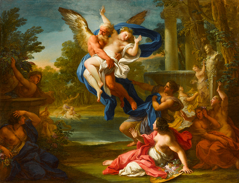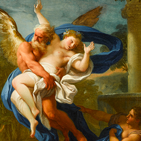 ギリシア・ローマ神話の男性の神々が気に入った女性を誘拐するエピソードは、ルネサンス以降の神話画において定番の主題となりました。こうした場面には、肉体の強さを利用して愛する者を手に入れようとする男性の欲望の表出を読み取ることができます。18 世紀イタリアの画家セバスティアーノ・コンカは、北風のボレアスが、川辺でニンフたちと遊んでいた王女オレイテュイアを力ずくで連れ去る場面を描きました。白髪の老人の姿をしたボレアスは、オレイテュイアの白く柔らかな身体をしっかりと抱きしめ、翼を広げて飛翔しています。