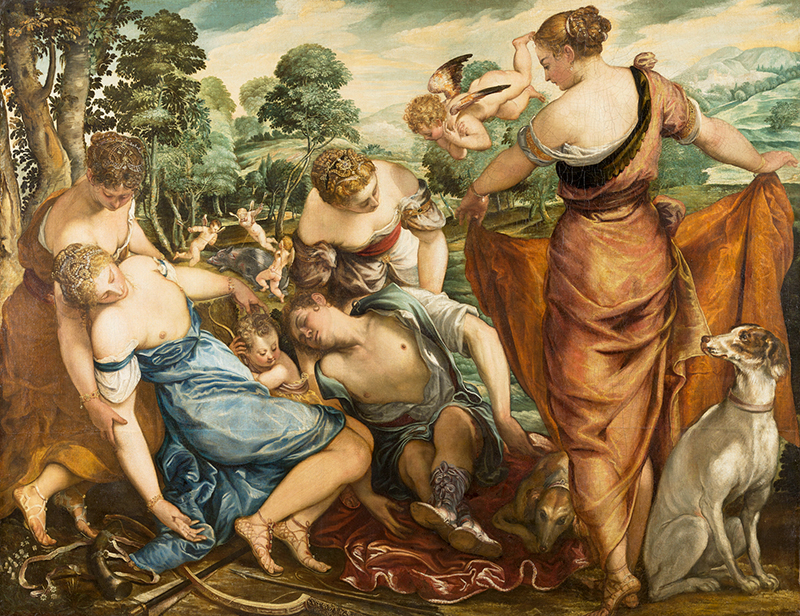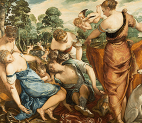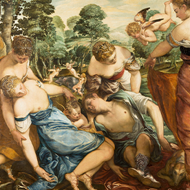 愛の女神ヴィーナスと絶世の美青年アドニスの悲劇の恋は、ルネサンス以降の西洋絵画で最も人気を博した画題の一つです。アドニスは、ヴィーナスの心配をよそに危険な狩りに出かけ、イノシシに突き殺されてしまいました。悲痛な結末を視覚化したこの作品には、中央に死せるアドニスが横たわり、その隣に気を失ったヴィーナスが配されています。三美神のうち二人の女神がアドニスとヴィーナスの身体をそれぞれ支え、3人目の女神は遺骸を覆うための布を手にしています。背景では3人の小さなアモル(キューピッド)が、悲劇を招いたイノシシを矢で痛めつけています。人物の大胆なポーズやダイナミックな構図には、16世紀ヴェネツィアの巨匠ティントレットの影響がうかがえます。