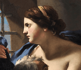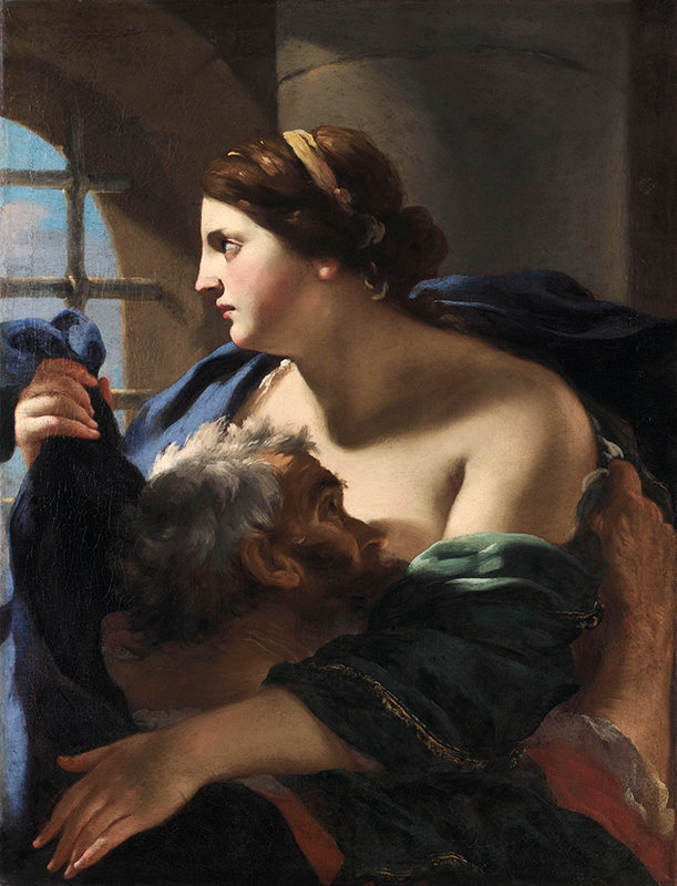 17世紀の画家シャルル・メランは、ロレーヌ公国(現フランス北東部)の首都ナンシーの出身でしたが、当時の芸術の中心地であったローマで主に活動しました。私たちはこの絵をふと目にした時、白髪の老人が若い娘の乳房を吸う情景にびっくりするかもしれません。しかし、描かれているのは親孝行の行いで、古代ローマの著述家ウァレリウス・マクシムスの『著名言行録』(1世紀)における、父キモンと娘ペロの教訓的な逸話に基づいています。年老いたキモンは牢獄で処刑を待つ身で、食物を与えられずにいました。ペロは獄中の老父を訪れ、ひそかに授乳して栄養を与えます。この場面は、孝心(子が親に寄せる愛)の模範として古代美術に表されたのち、16世紀ルネサンス以降の美術で再び取り上げられ、キリスト教の慈悲の行いを表す図像の原型にもなりました。