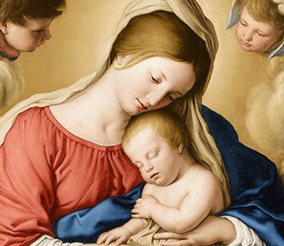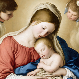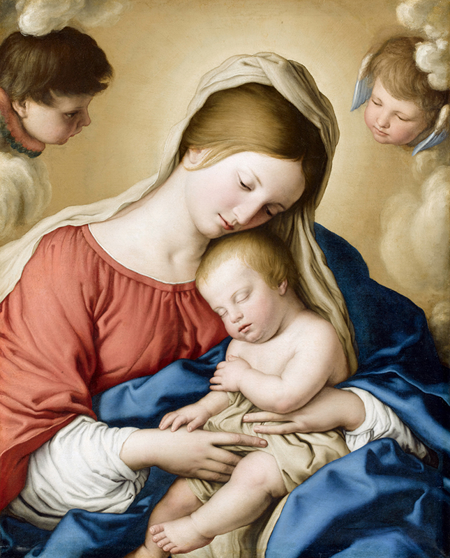 幼子イエスを優しく胸に抱き、清らかな寝顔をそっと見つめる聖母マリア。ほのかに憂いを帯びたその表情は、いずれ人類の罪をあがなうために十字架にかけられ、命を落とすことになる我が子の運命に想いを馳せているようにみえます。眠る幼子を抱く聖母像は、キリストの受難の暗示として、ルネサンス以降頻繁に描かれるようになりました。17世紀イタリアの画家サッソフェラートはこの画題で人気を博し、サイズや構図の細部を変化させながら、多くの作例を残しています。見る者は、優しい感情を呼び起こすサッソフェラートの聖母子像に親子愛や人間愛の手本を見いだし、信心を強くしたことでしょう。