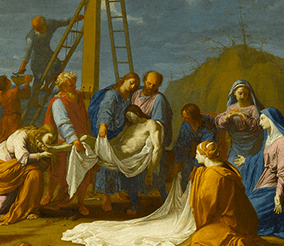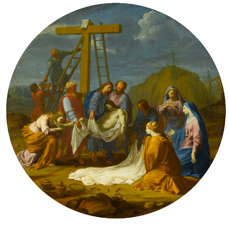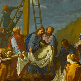 神は我が子キリストに、人類の罪をあがなうために十字架にかけられ、犠牲の死を遂げる過酷な運命を与えました。その意味で、キリストの磔刑は、人間に対する神の愛の表れとみなすことができます。この作品には、磔刑の直後、キリストの遺骸を十字架から降ろす場面が描かれています。聖書の記述に従い、3人の男性(右からアリマタヤのヨセフ、聖ヨハネ、ニコデモ)がキリストの遺骸を運び、その足にマグダラのマリアが口づけしています。画面右の女性たちのなかには、我が子に向かって片腕を伸ばす聖母マリアの姿が見えます。作者のル・シュウールは17世紀フランスの画家で、整然とした構図、明確な輪郭線、明快な配色を特徴とする古典主義様式を極めました。青と茶の対比に基づく落ち着いた色調と抑制された感情表現が、人々の深い悲しみをみごとに伝えています。