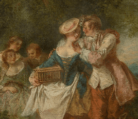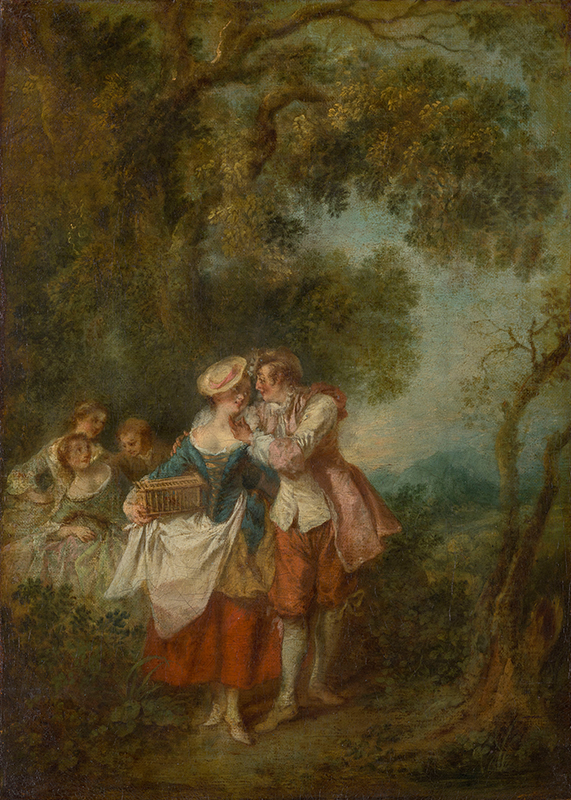 18世紀のフランスでは、理想化された美しい田園で繰り広げられる羊飼いや農民の恋を綴ったパストラル(田園詩)が流行しました。ヴァトーと同時代の画家ニコラ・ランクレによる本作は、こうした文学や戯曲の潮流を反映したものです。のどかな牧歌的風景の中で、演劇の衣装に身を包んだ若い男女が楽しげに見つめ合っています。女性は一羽の鳥の入った鳥籠を小脇に抱えています。当時、若い女性が鳥籠を持つ図像は、恋のとりことなる幸福の寓意として知られていました。また、伝統的に鳥のモチーフはエロティックな意味と結びつけられ、飛び立つ鳥は失恋、鳥の死は処女喪失のメタファーとして描かれることがありました。
