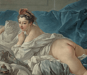 18世紀フランスの巨匠ブーシェは、しばしば神話画において女神ヴィーナスやディアナの美しいヌードを描き、官能的な表現を展開しました。しかし《褐色の髪のオダリスク》は文学には依拠していません。ここでは、ブーシェは18世紀のヨーロッパの人々がイスラム世界のハーレム(後宮)に抱いた幻想を下敷きにしながら、エロティックな人物そのものの表現を追求しました。ほんのりバラ色に染まる白い肌を露わにした女性が、当時トルコ風と呼ばれていたソファーに腹ばいになり、誘うように振り返って、茶目っ気のある眼差しをこちらに送っています。構図のまさに中央に彼女のふくよかな臀部が配され、挑発的なエロティシズムが極限まで強調されています。
