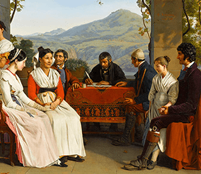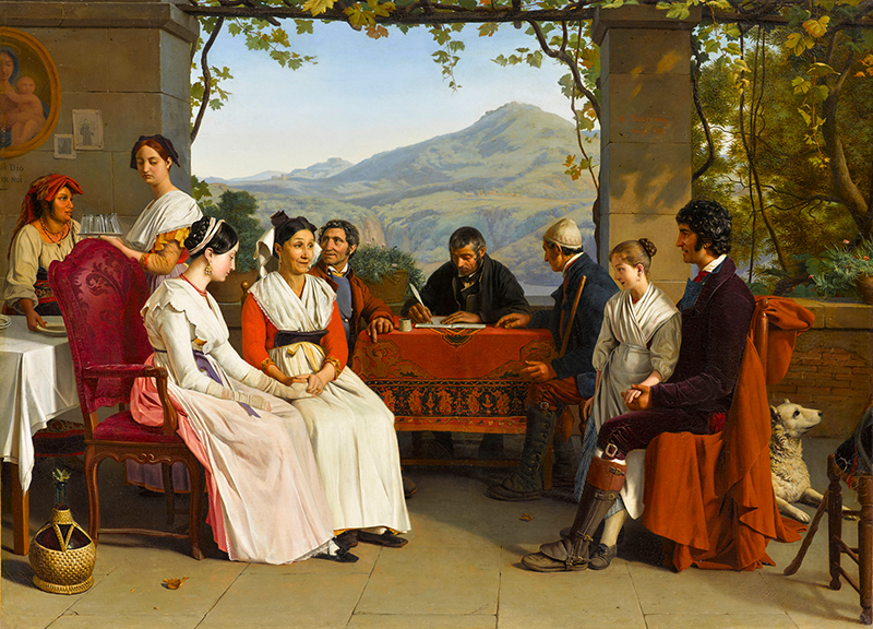 19世紀フランスの画家ギヨーム・ボディニエは、27歳のときにイタリアを訪れると、この土地の人々の風俗に大いに魅了されました。ここで描かれているのは、ローマ近郊アルバーノの裕福な農民一家で、婚姻契約が執り行われています。美しい丘陵を背景に、公証人は契約書の起草に没頭し、その手前では、結婚する男女が向かい合って座っています。男が真っ直ぐに許嫁を見つめる一方で、美しい衣装で着飾った娘は恥ずかしげに目を伏せています。その横では、母親が娘の手を優しく握っていますが、背後にいる父親は、宴席の準備をする召使いの女性にすっかり目を奪われているようです。様々なかたちの「愛」が見え隠れする、陽気で微笑ましい光景には、描かれた人々に対する画家の愛情も感じられます。