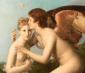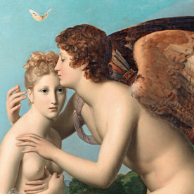 この物語は古代以来、彫刻や絵画に表現されてきましたが、フランスでは特に18世紀末に流行しました。新古典主義の画家ジェラールが1798年のサロンに出品し、注目を集めたこの作品には、若く美しいアモルがプシュケの額にそっとキスするロマンティックな瞬間が描かれています。当時の批評家たちは、目が見えていないようなプシュケの表情や、思春期を思わせる身体の表現に、初めて愛を意識した無垢な少女の驚きを読み取りました。彼女の頭上に蝶が舞っているのは、「プシュケ」がギリシア語で「蝶」と「魂」を意味するためです。当時アモルとプシュケの恋は、プラトン主義の解釈に基づき、神の愛に触れた人間の魂が試練を経て幸せを知る物語と解されていました。 -
