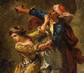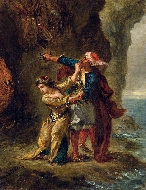 ドラクロワは、19世紀フランスのロマン主義を代表する画家です。本作の主題は、イギリスの詩人バイロンが1813年に発表した「アビドスの花嫁」に基づきます。オスマン帝国時代、パシャ(高官)の娘ズレイカと、その兄(実は従兄)である海賊の首領セリムの恋仲を死が引き裂く悲恋物語が描かれています。画面では、二人が洞窟の前で何やら揉めています。ズレイカは父から政略結婚を決められたことを打ち明けたのですが、セリムはそれに反対し、愛するズレイカを守ろうとします。しかし父が娘を取り返そうと放った軍隊がすぐ背後に迫っており、まさに多勢に無勢。波打ち際まで追い詰められ、死に瀕しつつも応戦しようとするセリムを、ズレイカが必死に引き留める――こうしたドラマティックな場面が、豊かな色彩表現と激しい筆致で想像力をかき立てるように表現されています。