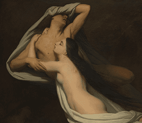 14世紀イタリアの詩人ダンテの叙事詩『神曲』は、フランスでは19世紀前半、ロマン主義の時代に流行し、なかでも「地獄篇」に登場するパオロとフランチェスカの悲恋は人気を博しました。古代ローマの詩人ウェルギリウスの案内で地獄を巡るダンテは、不義の恋の末に断罪され、永遠に地獄を漂うパオロとフランチェスカの亡霊に出会います。ラヴェンナの城主の娘フランチェスカは政略結婚でリミニの城主に嫁ぎましたが、夫の弟パオロと恋に落ち、嫉妬した夫によって二人とも短刀で刺し殺されてしまいました。ロマン主義の画家シェフェールは、パオロとフランチェスカの官能的な裸体を対角線上にドラマティックに配置しました。悲しげに目を閉じた二人は、固く抱き合ったまま地獄の風に吹かれています。画面右ではウェルギリウスとダンテが物思いに沈んでいます。シェフェールはこの主題に早くから取り組み、複数のヴァージョンを制作しました。本作はその一点です。
