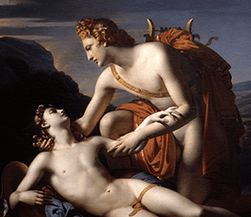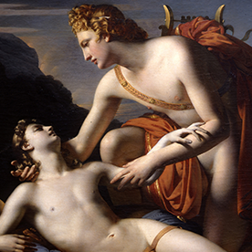 さて、神話上の恋人たちの愛はどんな結末に至るのでしょうか?バッカスとアリアドネ、アモルとプシュケなど、結婚というハッピーエンドを迎える愛がわずかながらあり、絵画にも描かれています。しかし、画家たちがより好んで取り上げたのは、恋人たちの片方が思わぬ事故で命を落とす、あるいは許されない恋に落ちた二人がどちらも死を選ぶといった、悲劇の結末でした。