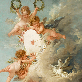 愛をテーマとする神話画のなかには、愛の神アモルを扱った作品もあります。翼を持つ可愛らしい子どもの姿をしたアモルは、王侯貴族の宮殿や邸宅を飾る装飾画において、人気のモチーフでした。本章の最後のコーナーではこうした作品を紹介します。