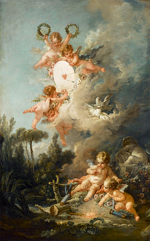 18世紀フランスの巨匠ブーシェによるこの作品は、「神々の愛」をテーマにした連作タペストリーの原画の一つで、道徳的に正しい愛の誕生の瞬間が象徴的に描かれています。古代神話によれば、神であれ人間であれ、愛の感情は、ヴィーナスの息子である愛の神アモル(キューピッド)が放った矢で心臓を射抜かれた時に生まれます。ここでは、ハートが印された標的に刺さる矢によって、恋人たちの愛の誕生が表されています。標的の上に舞うアモルは、高潔な愛で結ばれた恋人たちに授ける月桂冠を高々と掲げ、地上では、二人のアモルがもはや不要になった弓矢を燃やしています。