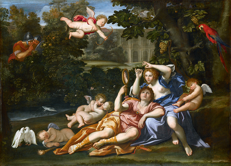 本作の主題は、イタリアの詩人トルクアート・タッソの叙事詩『エルサレム解放』(1581年)に由来します。タッソは、第一回十字軍(11世紀末)で聖地エルサレムを異教徒から取り戻すために旅立ったキリスト教徒の騎士たちの冒険を詩に綴りました。なかでも騎士リナルドとイスラム教徒の魔女アルミーダの恋物語は人気を博し、17世紀にしばしば絵画化されています。敵であるリナルドを殺すはずが、恋をしてしまったアルミーダは、魔力で彼を誘拐して自分の宮殿に運びました。17世紀イタリアの画家ドメニキーノによるこの作品では、遠くに宮殿を望む庭園の木陰で、恋の炎を燃え上がらせる二人が描かれています。周りには愛の神アモル(キューピッド)たちが散りばめられ、恋の情熱が強調されています。画面左、緑の茂みの向こうにはリナルドを探す二人の騎士の姿が見えます。