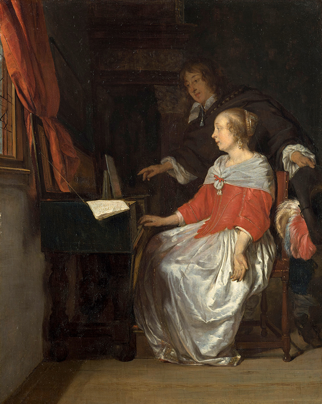 ともに音楽を奏でる男女は17世紀後半のオランダで流行した画題の一つで、多くの場合、愛に関する寓意が託されています。ライデンに生まれ、アムステルダムを活動地としたハブリエル・メツーの本作品では、ブルジョワ階級の小奇麗な家の室内で、洗練された身なりの女性がヴァージナルを弾いています。彼女は背後に立つ男性と楽譜について話し合っているようです。おそらく二人は恋人同士でしょう。目を合わせたり触れ合ったりはしていませんが、同じ楽譜を見つめる彼らの調和した姿には、愛の絆を読み取ることができます。