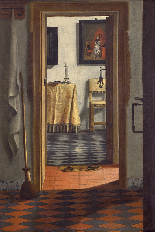 17世紀オランダの画家サミュエル・ファン・ホーホストラーテンは、美術理論家としても活動しました。オランダ市民の家の室内を描いたこの作品には、彼が精通した遠近法が巧みに用いられており、私たちの視線は絵画空間の奥へと導かれます。戸口の向こうに3つの部屋が連なっていますが、住人の姿がどこにも見えず、奇妙な感覚にとらわれます。しかしよく観察すると、意味ありげなモチーフに気付くでしょう。ひときわ目を引くのは、慌てて脱ぎ捨てられたかのように床に散らばる部屋履きです。また、奥の扉の錠前には鍵が差し込まれたままになっています。この家の女主人は自分がすべきことを途中で投げ出し、どこかで不謹慎な愛の誘惑に身をゆだねているのでしょうか…。密やかなエロティシズムが独創的な画面構成と相まって、私たちの好奇心をそそります。