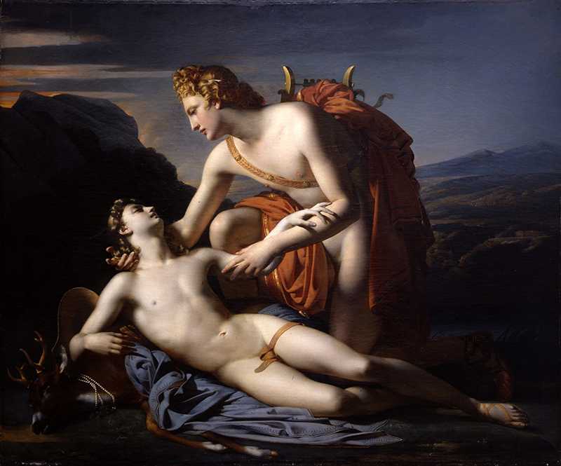 アポロンと美少年キュパリッソスの愛の神話は、19世紀フランスの新古典主義の美術でしばしば取り上げられました。可愛がっていた牡鹿をうっかり投げ槍で殺してしまったキュパリッソスは、生きる気力を失い、永久に嘆き続けたいと神々に哀願した結果、糸杉に変身します。この作品では、牡鹿にもたれるように横たわったキュパリッソスの頭を、かがみこんだアポロンが優しく支えています。筋肉の凹凸の表現が抑えられたキュパリッソスの優美な裸体は両性具有的に感じられますが、おそらく当時の人々にとっては、子どもと大人のはざまにある思春期の若者の理想的な身体表現でした。作者のクロード=マリー・デュビュッフ(1790-1864年)は、神話画と宗教画を手がけつつ、パリのブルジョワ階級の趣味に応じた肖像画でも人気を博した画家です。