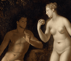 旧約聖書の「創世記」によれば、神が作った最初の夫婦アダムとエバは、エデンの園で、互いに恥ずかしいと思うことなく裸で暮らしていました。しかし、蛇にそそのかされたエバは、神から食べることを禁じられていた善悪の知識の木の果実を食べ、アダムにも与えます。この時から二人は裸であることを意識し、神の怒りに触れて楽園から追放されてしまいました。ここに描かれているのは、アダムとエバがまさに罪を犯そうとする場面です。両手に禁断の果実を持ったエバは、その一つを自分の口に運ぼうとし、アダムは驚いたような身振りでエバを見つめています。蛇は描かれていませんが、悪の象徴と解釈されるトカゲが地面を這っています。