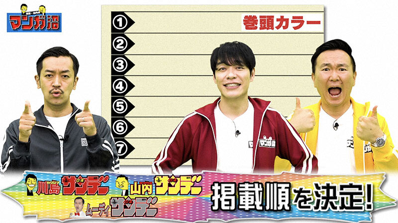 読売テレビ 4月1日(土) 深夜1時28分 日本テレビ 4月6日(木) 深夜2時29分 「夢の最強ラインナップを考えよう!週刊少年サンデー編」後編 「夢の最強ラインナップを考えよう!週刊少年サンデー編」後編を放送!ムーディ勝山と川島・山内が自分の少年サンデーに載せたい7作品を選抜!表紙に載せたいグラビアタレント&掲載順発表で川島が山内のギリギリな行動に厳重注意!?4コマバトルにプロマンガ家が参戦! ゲスト・・・ ムーディ勝山
