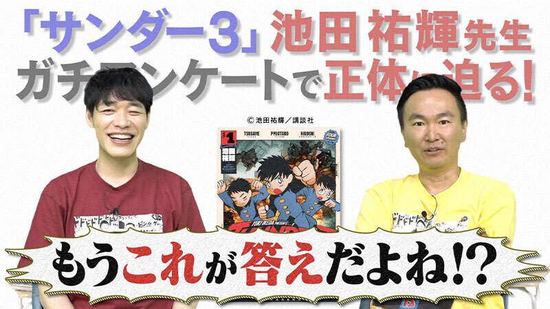 読売テレビ 9月16日(土) 深夜1時46分 日本テレビ 9月21日(木) 深夜3時9分 「マンガ家ガチアンケート」前編 山内激推しの少年冒険SF『サンダー3』作者・池田祐輝を深堀りする「マンガ家ガチアンケート」前編を放送。年齢や出身地は非公表…謎だらけの池田先生の“正体”に迫る!テレビ初出し自画像やアンケートをもとに徹底検証!ネットで噂の『GANTZ』奥浩哉先生の別名義説にも切り込む!