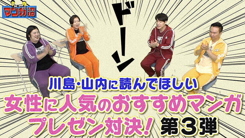 読売テレビ 10月28日(月) 深夜0時59分 日本テレビ 10月31日(木) 深夜2時29分 「川島・山内に読んで欲しい 女性に人気のおすすめマンガプレゼン対決」第3弾前編 紅しょうが・熊元プロレスとエルフ・はるを迎えて「川島・山内に読んで欲しい 女性に人気のおすすめマンガプレゼン対決」第3弾前編を放送。マンガ大好き女性芸人2人がSNSで大人気の胸キュンマンガ『星屑の王子様』『気になってる人が男じゃなかった』の魅力を熱く語り尽くす!! ゲスト・・・ 熊元プロレス(紅しょうが)・はる(エルフ)