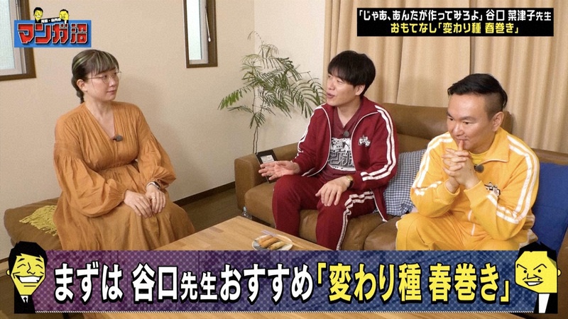 読売テレビ 7月21日(月) 深夜1時9分 日本テレビ 7月24日(木) 深夜2時5分 「出張!マンガ家ガチアンケート」第3弾 ② ロケ企画「出張!マンガ家ガチアンケート」第3弾を2週連続放送。川島おすすめマンガ『じゃあ、あんたが作ってみろよ』『まめとむぎ』連載中、谷口菜津子先生の仕事場兼自宅にお邪魔!各マンガ賞で話題の2作の誕生秘話披露&先生お手製絶品「変わり種春巻き」で2人をおもてなし! ゲスト・・・ 谷口菜津子