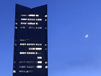 会社からの帰り道で、近くにある「クリスタルタワー」というビルを見たら、その横に綺麗な「三日月」が出ていました。