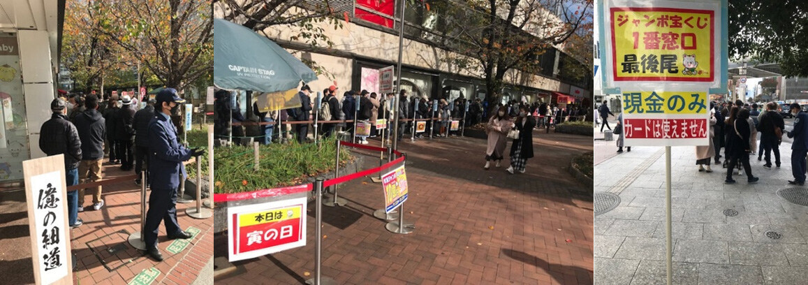 の売り場にできた長い行列でした。警備員が出て列の整理もやっています。有楽町の売り場はよく「一等」が出るとか、そういったことで人気があるんでしょうね。私も以前は買っていましたが。それにしても、朝っぱらからスゴイ列。