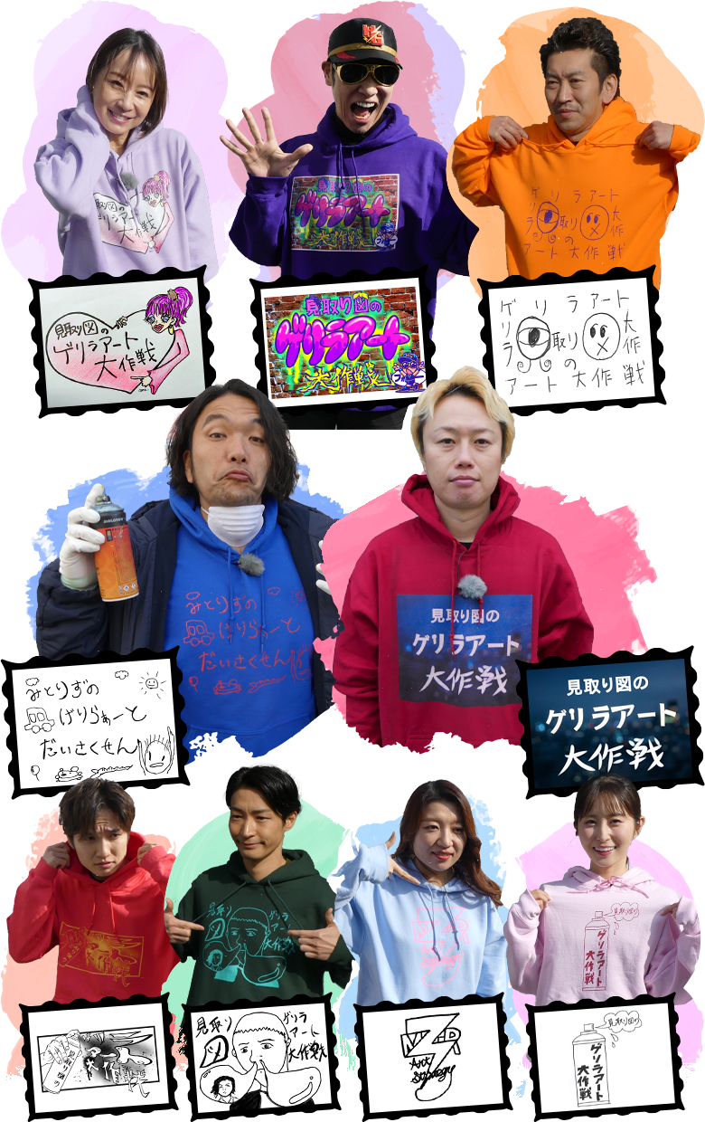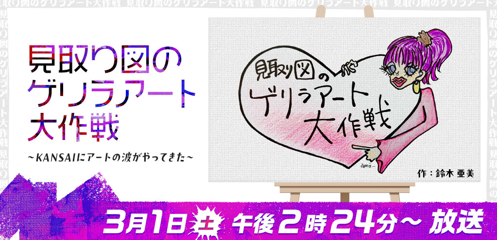 見取り図をはじめとする、吉本のクリエイティブ自慢の「次世代アート芸人」たちが、 “アート”の波がきている関西&大阪で、その魅力をお届けします。 今回の舞台は大阪・北加賀屋。 今ひそかに「アートの街」として注目を集める北加賀屋で、街ブラしながら個性豊かなアート作品を制作していきます。 果たして、どんな作品が出来上がるのでしょうか。 また、読売テレビ主催のアートイベント「モネ&フレンズ・アライブ神戸展」(3/30まで開催中)ともコラボ! 出演者がイベントを体感するとともに、ロケで着用した、それぞれが創作した“番組ロゴ”入りパーカーを 「モネ&フレンズ・アライブ神戸展」会場で放送後に展示予定(3/5~18)。 さらに「みっけ展 supported by anna」(3/22・23、3/27~30)でも展示予定。 アートの魅力がたっぷりつまった60分です。